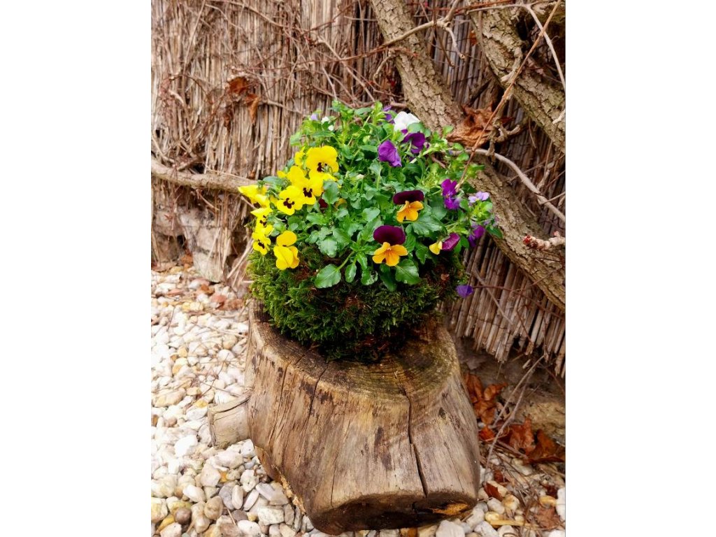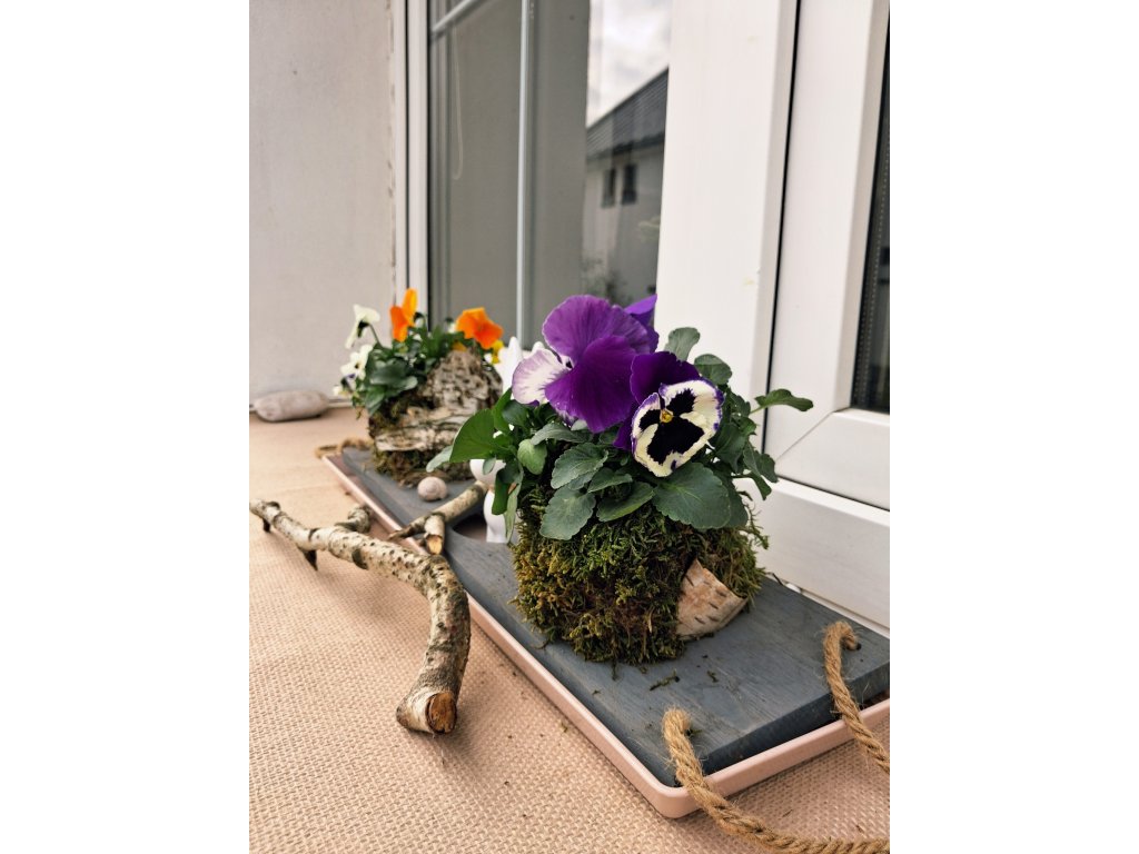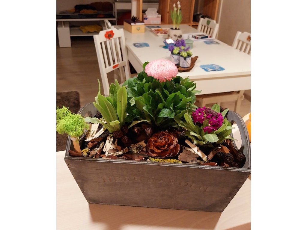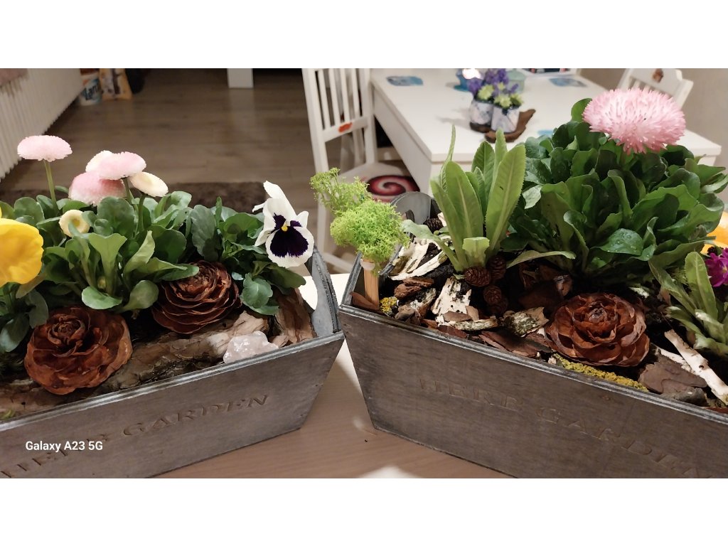 Můžete si vybrat, zda chcete celý dřevěný truhlík z trvalek, či jarní dočasné krásy masešek v mechu či březové kůře.
